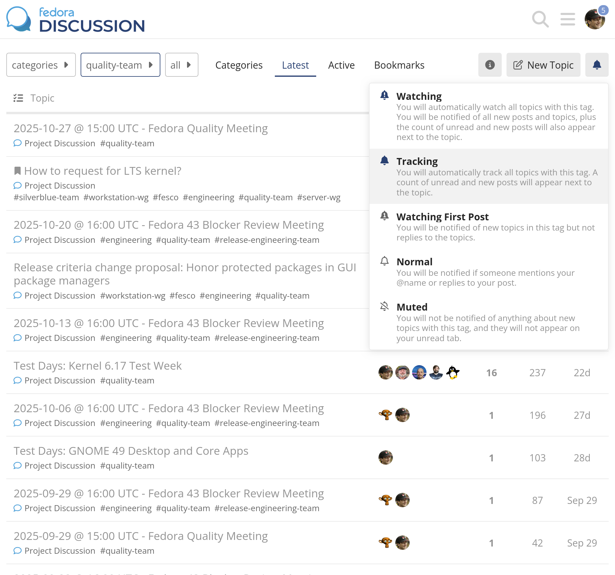 At Fedora Discussion you can find our topics under the quality team tag. (You can also subscribe to this tag, when logged in. Click the bell icon and pick Tracking).